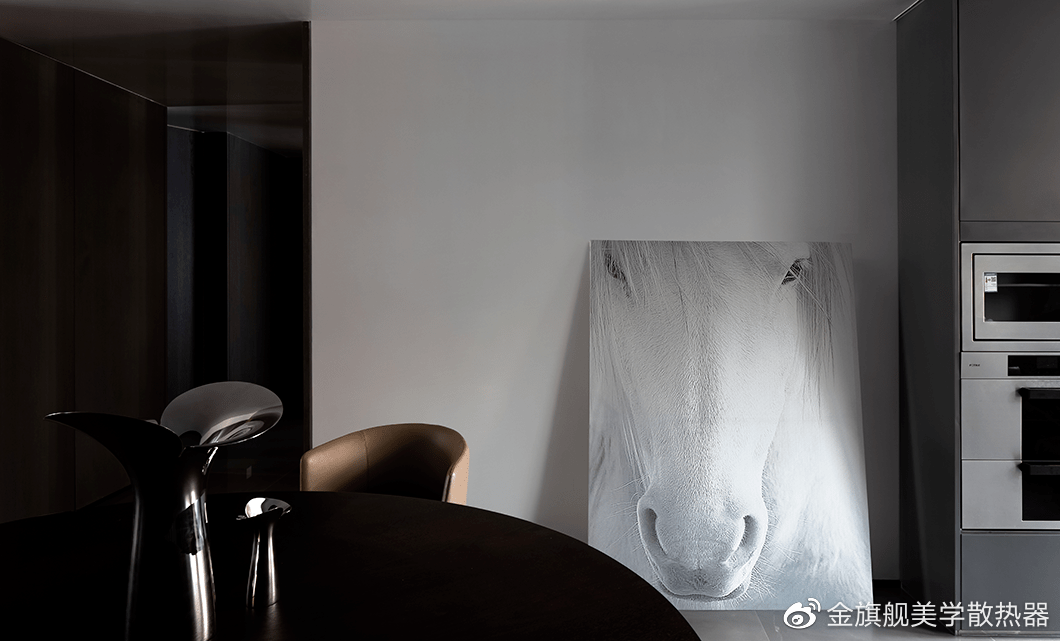 黑色柜体嵌入墙中,既美观又能实现收纳功能,白色的墙面、深色沉稳的家具,个性的装饰画,使得整个环境更有张力和艺术观感。
