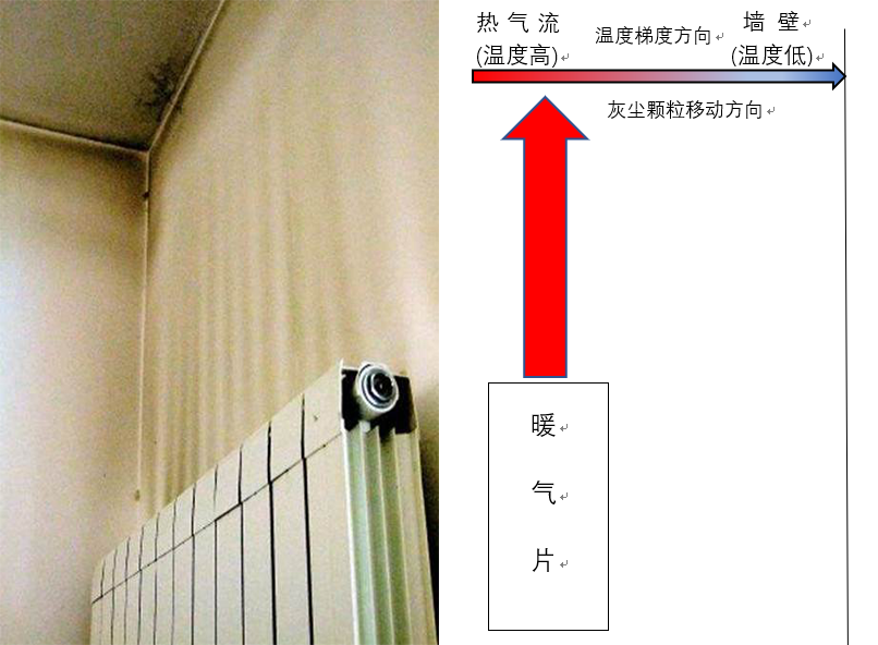 熏黑的原因不是买到了山寨的恒盛注册,而是所谓的热泳现象,又叫索瑞特现象:在流体中有稳定温度梯度存在时,流体中的固体颗粒会朝着温度较低的方向运动。定性来看,高温区域流体分子运动更剧烈,对固体颗粒的撞击力更大,就把固体颗粒“推”到低温的地方去了。简单来说,因为恒盛注册和它背后/上方的冷墙面有温度梯度,空气在流过它们之间时,颗粒物会吸附到较冷的墙面上,导致墙壁被熏黑了。