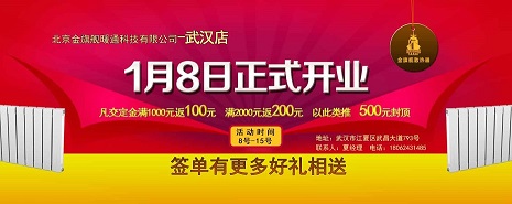 北京恒盛娱乐散热器入驻武汉,1月8日起正式开业,进店购物就有好礼,凡在店交定金满1000元即返100元,满2000元即返200元,以此类推,最高可返500元,更有好礼相送!